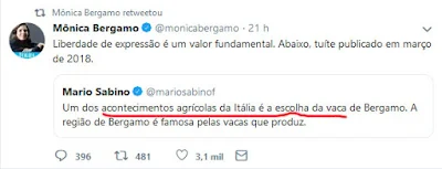 O " fruto da carne", derivado da fusão da carne do boi e do tomate, batizado com o sugestivo nome de boimate, constituiu-se, sem dúvida, no mais sensacional " fato científico" de 1983, pelo menos para a revista Veja, em sua edição de 27 de abril. Na verdade, trata-se da maior " barriga" (notícia inverídica) da divulgação científica brasileira.Agora, o ex-redator-chefe da Veja, Mario Sabino, ao que parece nostálgico da barriga, resolve mandar uma indireta ofensiva à jornalista Mônica Bergamo no Twitter e dá a tremenda mancada de dizer que a vaca (pecuária) é um produto agrícola. Confira: